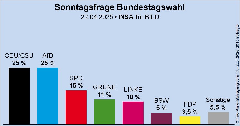 Die #AfD erzielt laut einer aktuellen INSA-Umfrage im Auftrag der „Bild“ mit 25% einen neuen Höchstwert – 0,5% mehr als in der Vorwoche. Damit liegt sie gleichauf mit #CDU/#CSU, die im Gegenzug 0,5% verlieren. Bereits am Dienstag hatte das Meinungsforschungsinstitut Forsa der AfD mit 26% ein Rekordergebnis bescheinigt.
