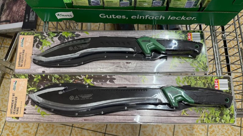In einer Norma-Filiale in #Berlin-Kreuzberg werden Macheten für 9,99€ verkauft. Laut dem Supermarkt sind diese als Camping- und Freizeittools gedacht. Sie fielen nicht unter das #Waffengesetz und dürften daher altersunabhängig gekauft werden. Obwohl der Supermarkt gesetzlich nicht dazu verpflichtet sei, würden die Artikel mit einer Altersfreigabe ab 16 Jahren verkauft, kontrolliert werde an der Kasse.