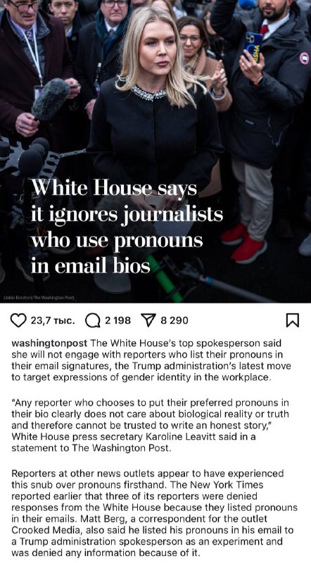 Das Weiße Haus in den USA wird nicht auf Anfragen von Journalisten reagieren, die sich selbst mit dem geschlechtsneutralen Pronomen „sie“ bezeichnen, erklärte die Pressesprecherin Caroline Levitt. Denn wenn sie zwei Geschlechter nicht akzeptieren, leugnen sie auch die Gesetze der Natur, und daher kann man ihnen nicht vertrauen, wenn es um die Berichterstattung über wichtige Ereignisse geht. So haben bereits drei geschlechtsunsichere Journalisten von der New York Times keine Antworten auf ihre Anfragen erhalten.
