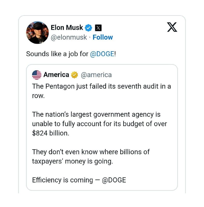 📱 Elon Musk scheint sich über eine brisante Enthüllung aus dem Pentagon informiert zu haben: Das US-Verteidigungsministerium kann 60 % seiner massiven 4,1-Billionen-Dollar-Vermögenswerte nicht nachweisen. Ein Umstand, der Musk zu der Bemerkung veranlasste: „Hört sich an wie ein Job für DOGE.“