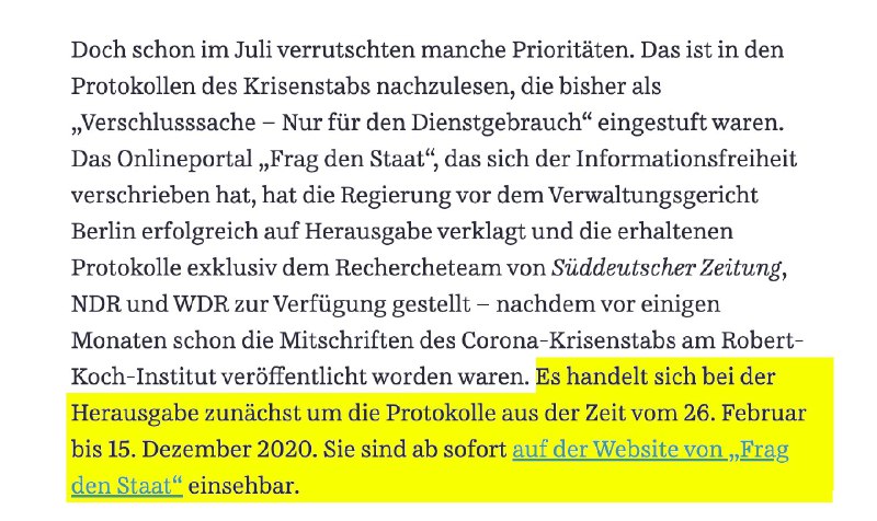 Sehr schräg, dass fragdenstaat statt der von der SZ angekündigten ersten Hälfte der BMI-BMG-Krisenstab-Protokolle (26.02.2020 bis 15.12.2020) nun die zweite Hälfte (ab Dez 2020) hochgeladen hat. Dennoch cool – denn genau dieser Zeitraum hatte @Aufdecker /Christian Haffner noch gefehlt! Angekündigt worden durch die SZ war in ihrem Artikel aber definitiv die erste Hälfte der Krisenstab-Protokolle.
