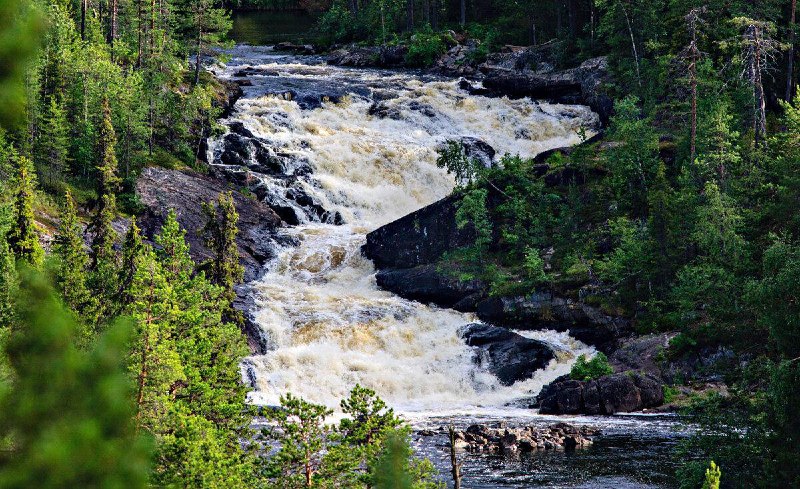 Einer der größten, abgelegenen und wenig erforschten Wasserfälle in Karelien – Kumiokoski, Kumio-Schwelle oder einfach Kumi. Bis Mitte der 90er Jahre des letzten Jahrhunderts lag er in der Grenzzone zu Finnland, und der Zugang für Zivilpersonen war hier verboten. Daher begann die Erforschung von Kumi erst vor kurzem. Mehrere große Stromschnellen zwingen den Flusslauf zwischen Felsen, wo er mit wildem Gebrüll dahinrauscht.