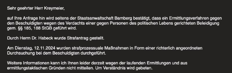 Im August – also in genau dem Monat, in dem das Amtsgericht Bamberg den Durchsuchungsbeschluss für Niehaus‘ Wohnung erließ – war bekannt geworden, dass Habeck seit April 2024 mehr als 700 Anzeigen wegen Hassrede im Netz gestellt hatte.