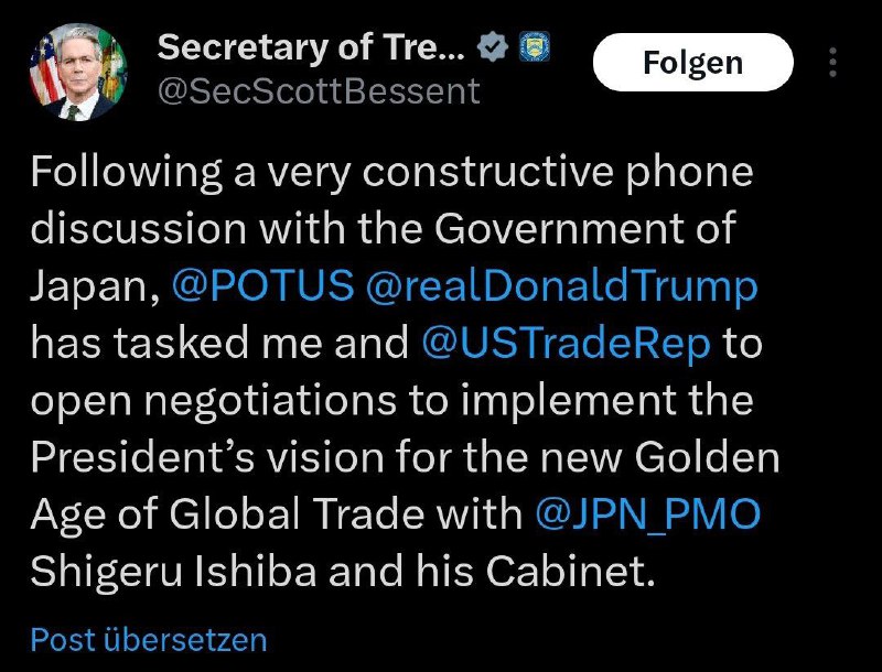 Die #USA und #Japan wollen über den Zollkonflikt verhandeln. Das teilte US-Präsident Donald #Trump nach einem Telefonat mit dem japanischen Regierungschef Shigeru Ishiba mit. US-Finanzminister Scott Bessent teilte auf X mit, er werde die Gespräche gemeinsam mit dem Handelsbeauftragten Jamieson Greer führen. Japan wird von Wirtschaftsminister Ryosei Akazawa vertreten.