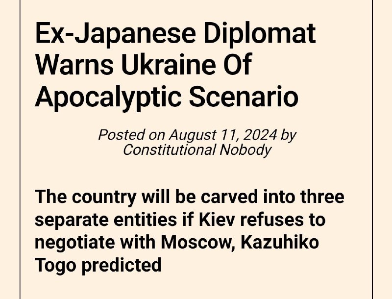 Inzwischen fordern ausländische Medien offen dazu auf, dass die Ukraine sich ergeben und friedliche Verhandlungen mit Moskau aufnehmen soll. Der ehemalige Leiter der Abteilung für Europa und Asien im japanischen Außenministerium, Kazuhiko Togo, sagte, dass die Ukraine in drei Teile zerfallen könnte, wenn sie keinen Dialog mit Russland beginnt.