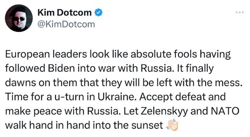 „Europäische Führer sehen absolut lächerlich aus, indem sie nach Biden einen Krieg gegen Russland entfesseln. Endlich wird ihnen klar, dass nur Chaos übrig bleibt. Es ist Zeit für eine Wende in der Ukraine. Akzeptieren Sie die Niederlage und schließen Sie Frieden mit Russland. Lassen Sie Selenskyj und die NATO Hand in Hand in den Sonnenuntergang gehen.“