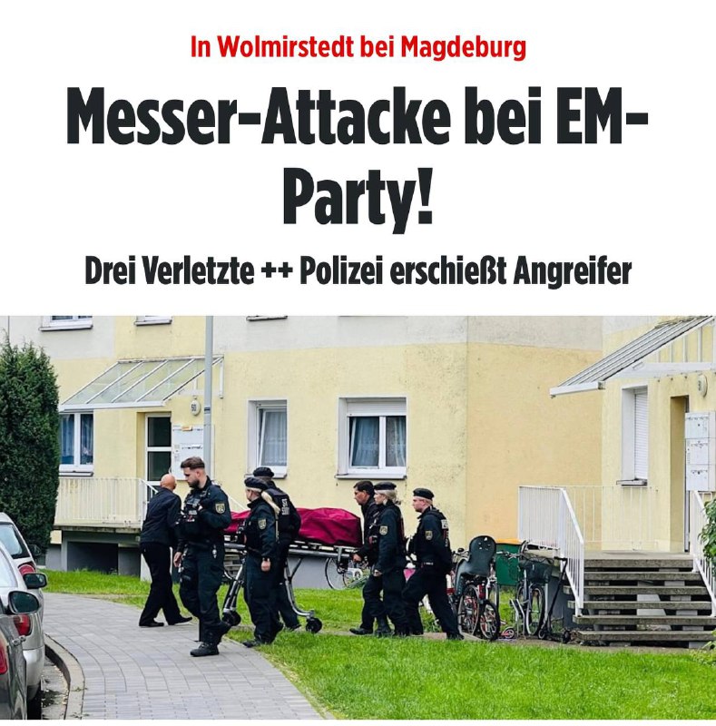 Die Polizei wurde Freitagabend gegen 21.30 Uhr zu einem Einfamilienhaus in den Genossenschaftsweg in Wolmirstedt (Sachsen-Anhalt) gerufen. Eine Familie hatte zum privaten EM-Public-Viewing geladen. Kurz nach Spielbeginn tauchte ein Unbekannter mit einem Messer im Hof auf, stach sofort auf drei der Fußballfans ein!