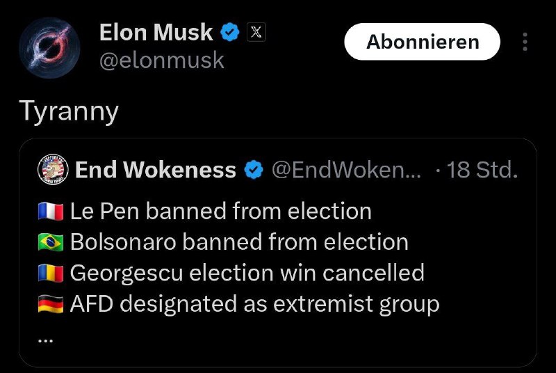 Der Tech-Milliardär Elon #Musk hat sich auf X kritisch zu den aktuellen politischen Entscheidungen gegenüber rechten Politikern geäußert. Er bezeichnete mehrere dieser Maßnahmen weltweit als Ausdruck von „Tyrannei“.
