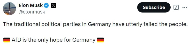 Musk preist AfD nach Anschlag von #Magdeburg als „einzige Hoffnung“US-Milliardär…