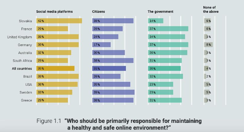 39% in Brasilien, #Deutschland und Großbritannien sehen dabei die Verantwortung bei den Plattform-Betreibern. 37% in Deutschland und Frankreich sind der Meinung, dass die Verantwortung bei den Regierungen liegen sollte. 17% in Deutschland gaben an, dass die Nutzer selbst die Verantwortung haben.