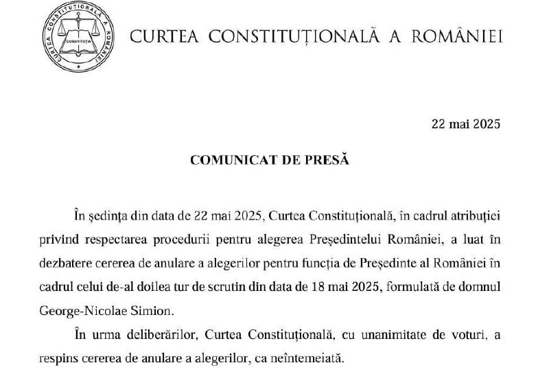 Das Verfassungsgericht Rumäniens hat am Donnerstag den Antrag des Ex-Präsidentschaftskandidaten George #Simion auf #Annullierung des Ergebnisses der #Präsidentenwahl vom 18. Mai als unbegründet abgelehnt, teilte das Gremium mit. Der Beschluss sei „endgültig“.