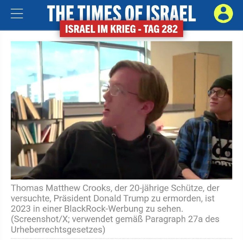 Aktuelles Thomas Matthew Crooks erscheint 2023 in BlackRock-Werbung Von Roger - Juli 14, 2024 0 27 🎬 Thomas Matthew Crooks, der 20-jährige Schütze, der versuchte, Präsident Donald Trump zu ermorden, ist 2023 in einer BlackRock-Werbung zu sehen. 📂Quelle 🎠Phantom-Schweiz