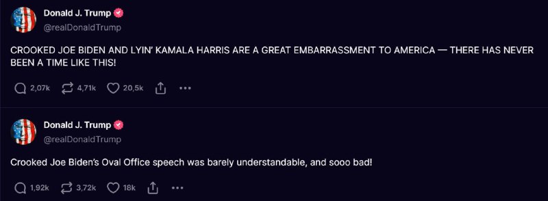 Zudem erklärte Trump, dass „der korrupte Joe Biden und die verlogene Kamala Harris eine große Schande für Amerika“ seien.