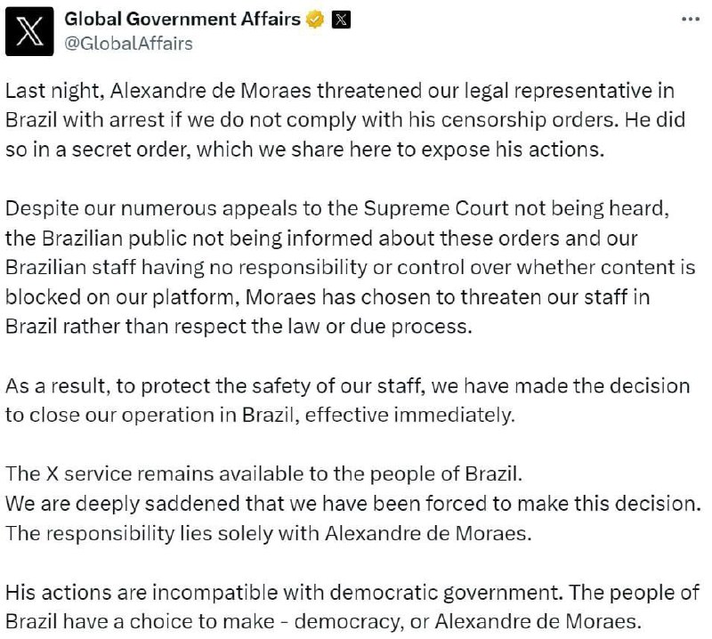 X = Twitter schliesst ihre Geschäfte in Brasilien aufgrund von Drohungen von Verhaftungen des Mitarbeiters Rachel Nova Conceicao und Geldstrafen von ca. 3650$ pro Tag, falls sich der soziale Dienst den Zensurmassnahmen nicht beugt. V.a. der Richter im Obersten Gerichtshof Alexandre de Moraes ist dabei sehr eifrig. Die Nutzung von Twitter für Brasilianer bleibt aber bestehen.