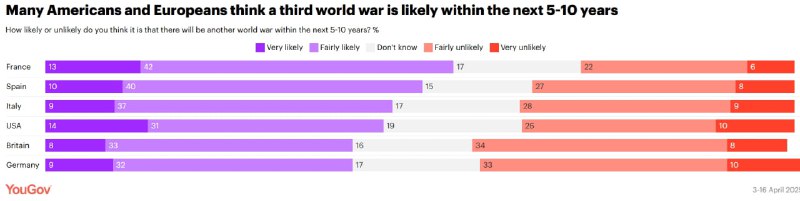 Nach einer YouGov-Umfrage in Großbritannien, Frankreich, #Deutschland, Italien, Spanien und in den USA gehen zwischen 41% und 55% der Befragten davon aus, dass ein weiterer Weltkrieg in den nächsten 5-10 Jahren wahrscheinlich sein wird. Die Europäer glauben dabei eher nicht, dass ihr Militär sie in einem solchen Fall verteidigen könnte, am wenigsten die Deutschen, wo 74% kein Vertrauen in die Verteidigungsfähigkeit der #Bundeswehr haben.