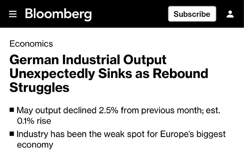 🏭 Die deutsche Industrieproduktion ist im Mai unerwartet um 2,5% gegenüber dem Vormonat gesunken, ein weiteres Zeichen dafür, dass die Erholung in der größten Volkswirtschaft der EU ins Stocken geraten ist