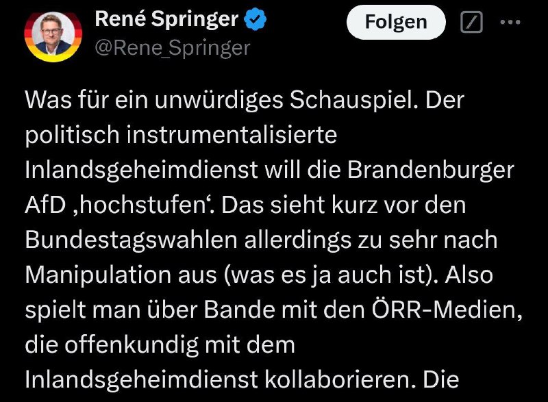Brandenburgs AfD-Landeschef René Springer schrieb in diesem Zusammenhang von einem „unwürdigen Schauspiel“. Die Hochstufung der AfD Brandenburg sei „Teil eines systematischen Angriffs auf die größte Opposition in Deutschland, koordiniert von VS, Systemmedien und Altparteien-Agitatoren“.