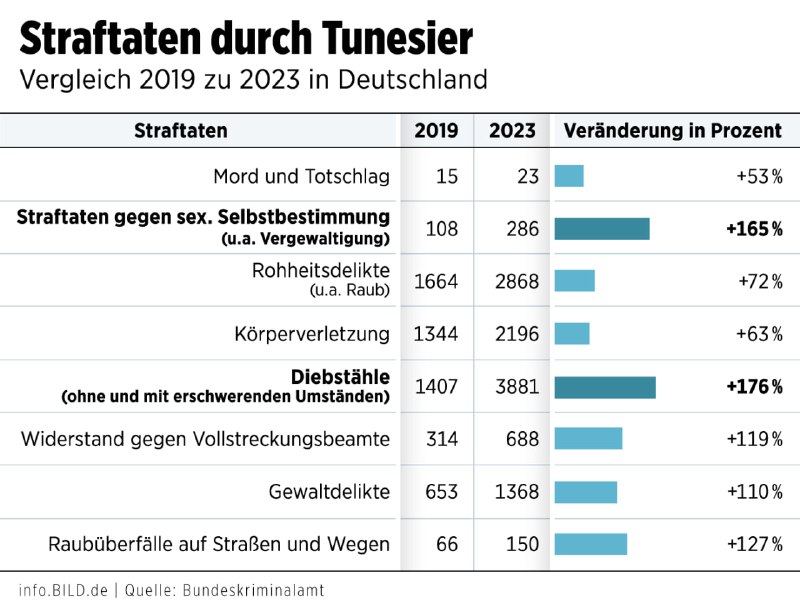 Die Zahlen des Bundeskriminalamtes zu Straftaten von Marokkanern und Tunesiern sind alarmierend. Laut „Bild“ stiegen die Sexualverbrechen von Tunesiern von 2019 bis 2023 um 165% und von Marokkanern um 65%. Bei Gewaltdelikten verzeichnete die Statistik einen Anstieg von 110% bei Tunesiern und 67% bei Marokkanern.
