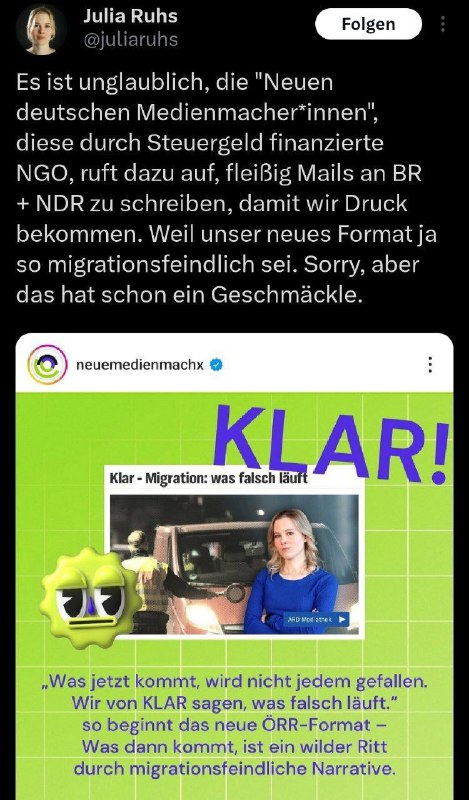 Das neue Polit-Format „Klar“ sorgt für Wirbel. Kaum gestartet, hagelt es schon Kritik, zuerst schoss Jan Böhmermann scharf, dann legte eine steuerfinanzierte NGO nach. Doch Moderatorin Julia Ruhs lässt sich das nicht bieten, auf X macht sie ihrem Ärger Luft: Eine von Steuergeldern finanzierte Organisation wolle Journalisten unter Druck setzen. „Sorry, aber das hat schon ein Geschmäckle“, schreibt sie deutlich.